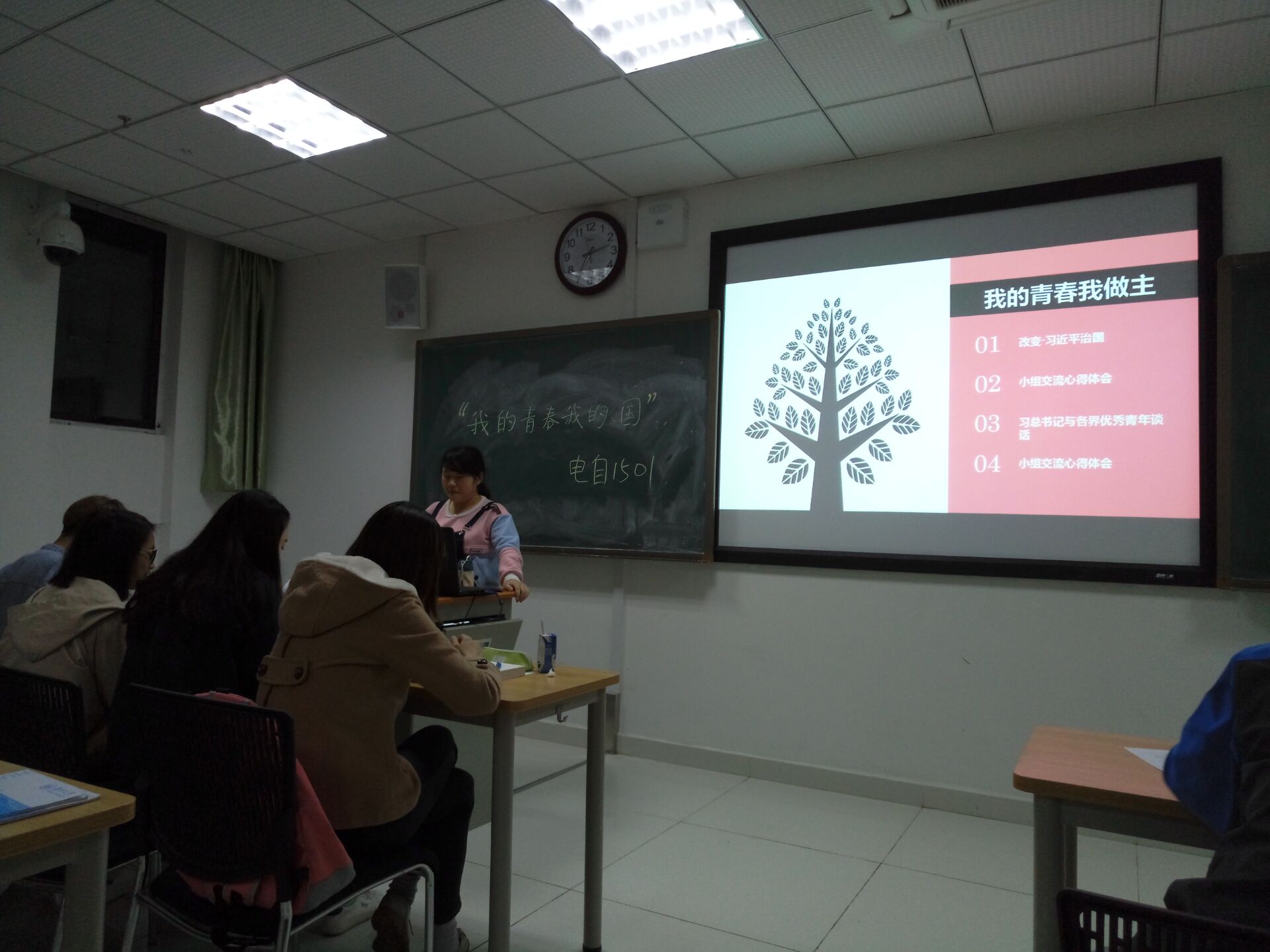 会议的最后,在王明君同学的提议下,全班同学每人都从总书记的九句话中选一句做为座右铭,并把写有自己座右铭的便利贴贴到黑板上,组成了一个大树的形状,象征在总书记的领导下,同学们努力学习,不断地提升自己的能力,勇敢承担青年的责任。
